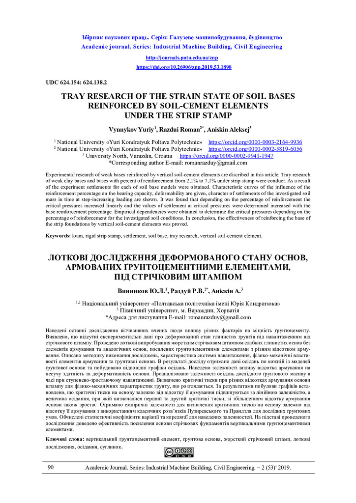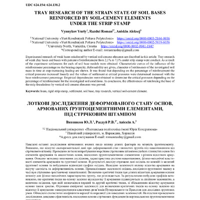 2020/08/01Tray research of the strain state of soil bases reinforced by soil-cement elements under the strip stamp