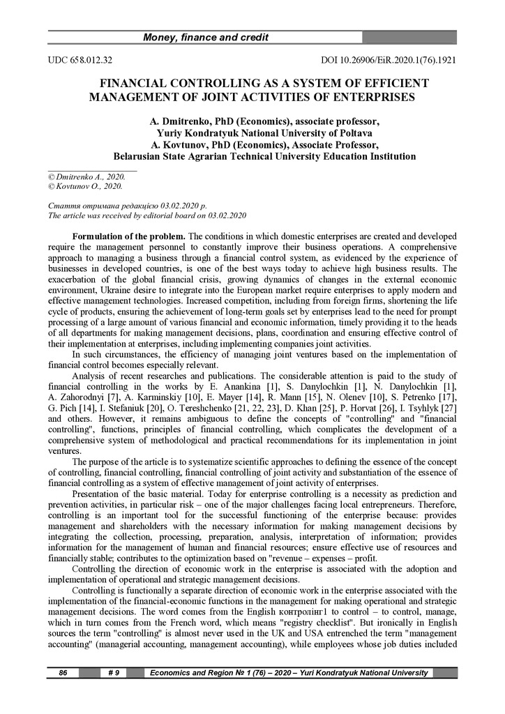 2020/09/15Belarusian State Agrarian Technical University Education Institution. Financial Controlling as a System of Efficient Management of Joint Activities of Enterprises