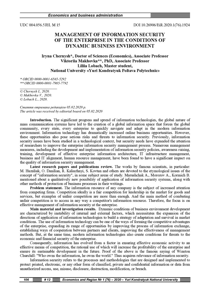 Management of information security Of the enterprise in the conditions of dynamic business environment