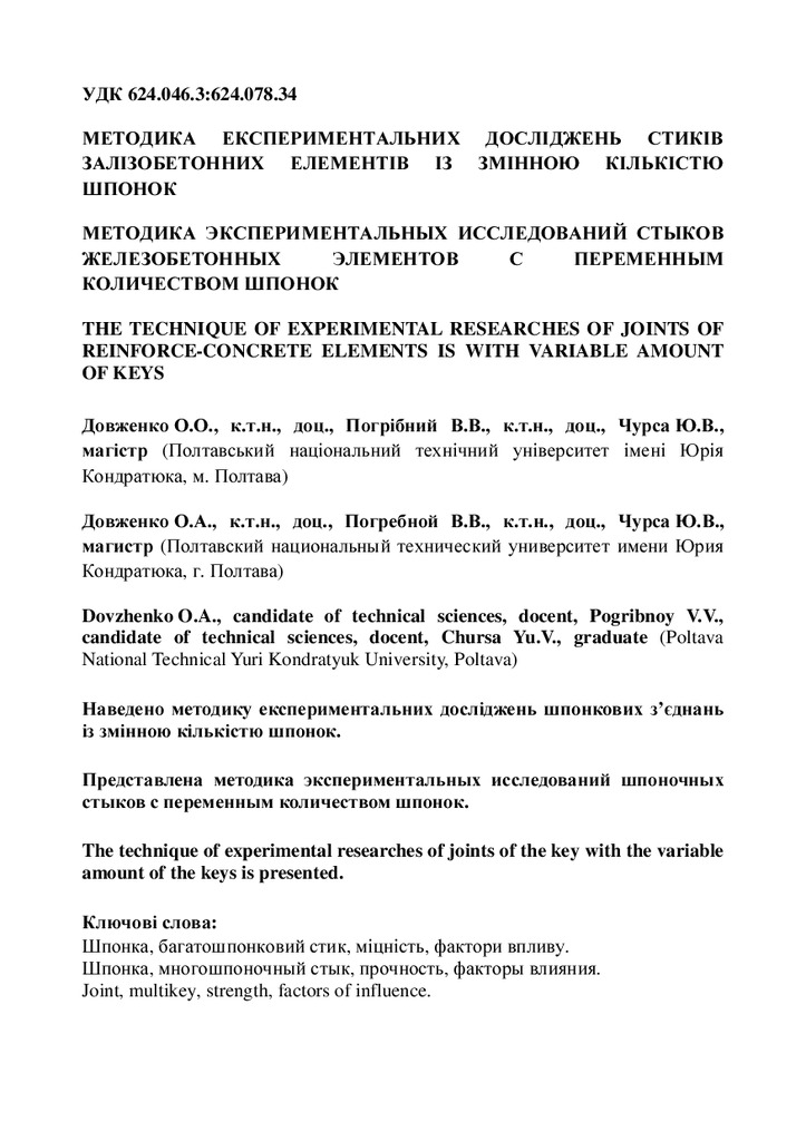 Наведено методику експериментальних досліджень шпонкових з’єднань із змінною кількістю шпонок.