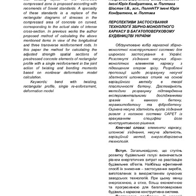 Обґрунтовано вибір каркасної збірномонолітної конструктивної системи для широкого застосування в Україні. Розглянуті з’єднання несучих збірномонолітних елементів каркасу з підвищеним опором зрізу. ...
