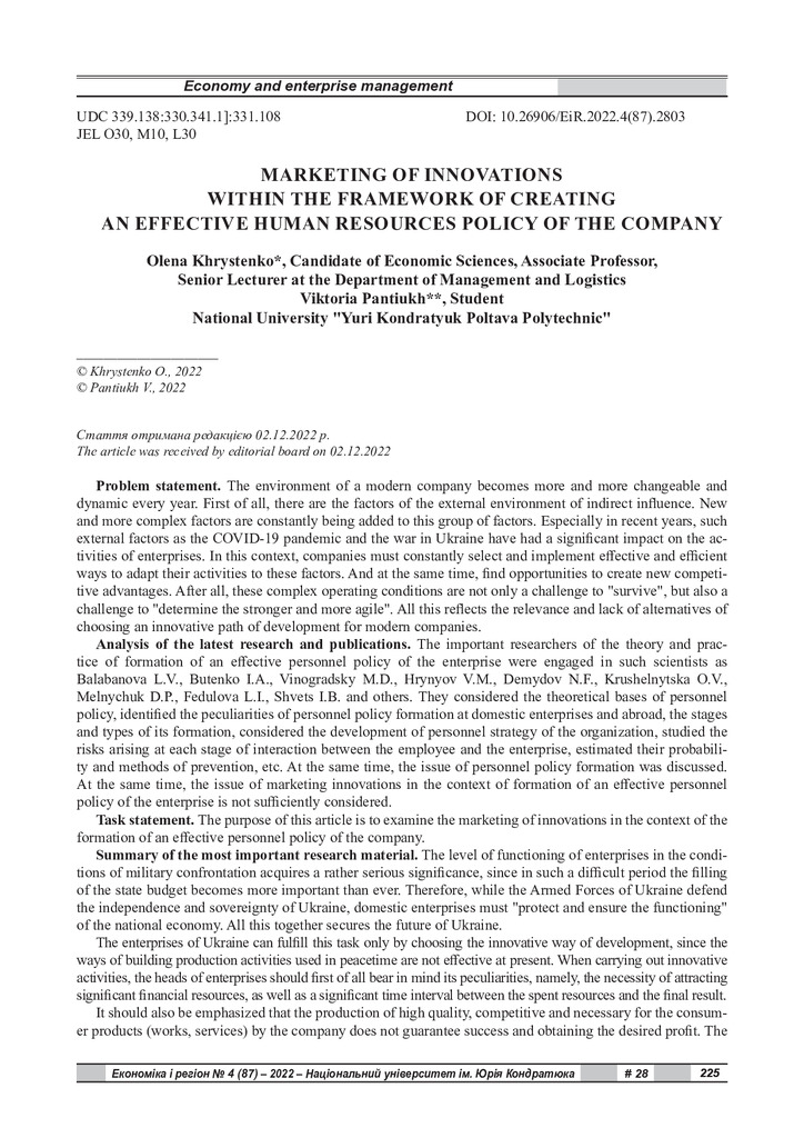 Marketing of innovations within the framework of creating an effective human resources policy of the company