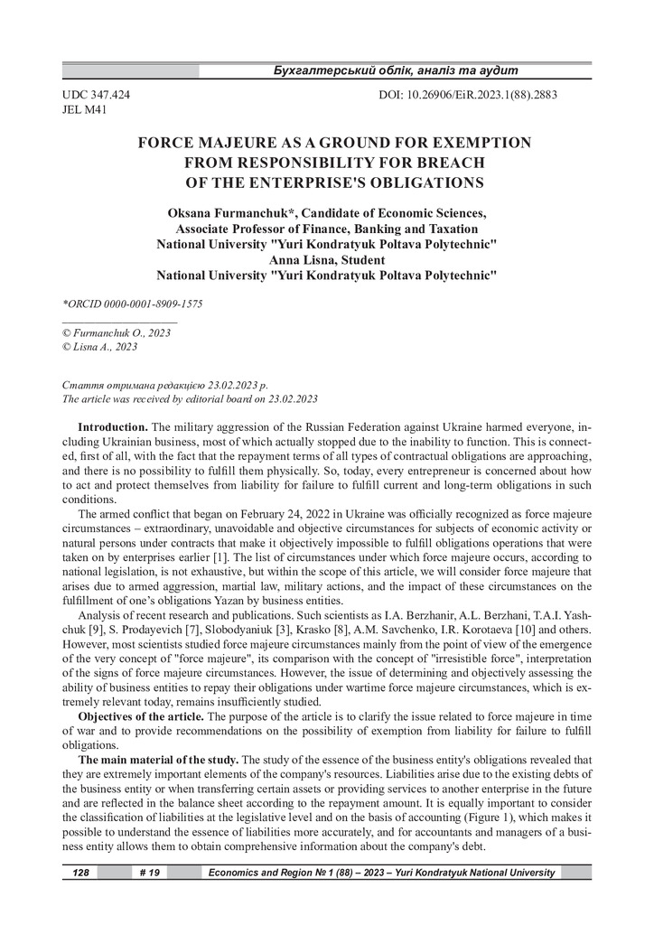 Force majeure as a basis for exemption from liability for breach of obligations of the enterprise