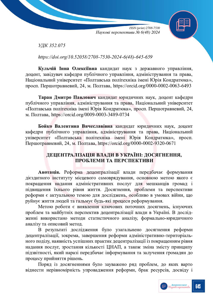 Децентралізація влади в Україні: досягнення, проблеми та перспективи