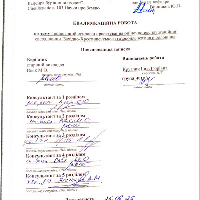 Роботу присвячено геологічному супроводу проектування оціночно- експлуатаційної свердловини у межах Західно-Хрестищенського родовища з проведенням геолого-технічних та геохімічних досліджень.