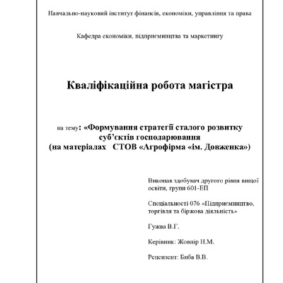 Формування стратегії сталого розвитку суб’єктів господарювання (на матеріалах СТОВ «Агрофірма «ім. Довженка»»)