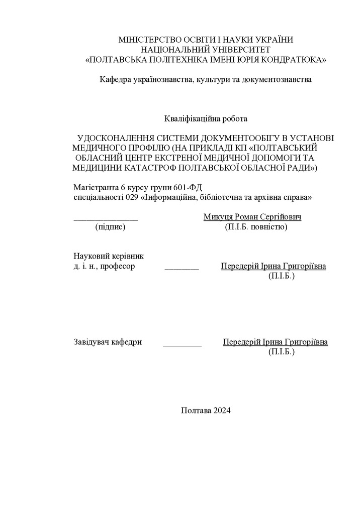 2024/04/28Удосконалення системи документообігу в установі медичного профілю (на прикладі КП «Полтавський обласний центр екстреної медичної допомоги та медицини катастроф Полтавської обласної ради»