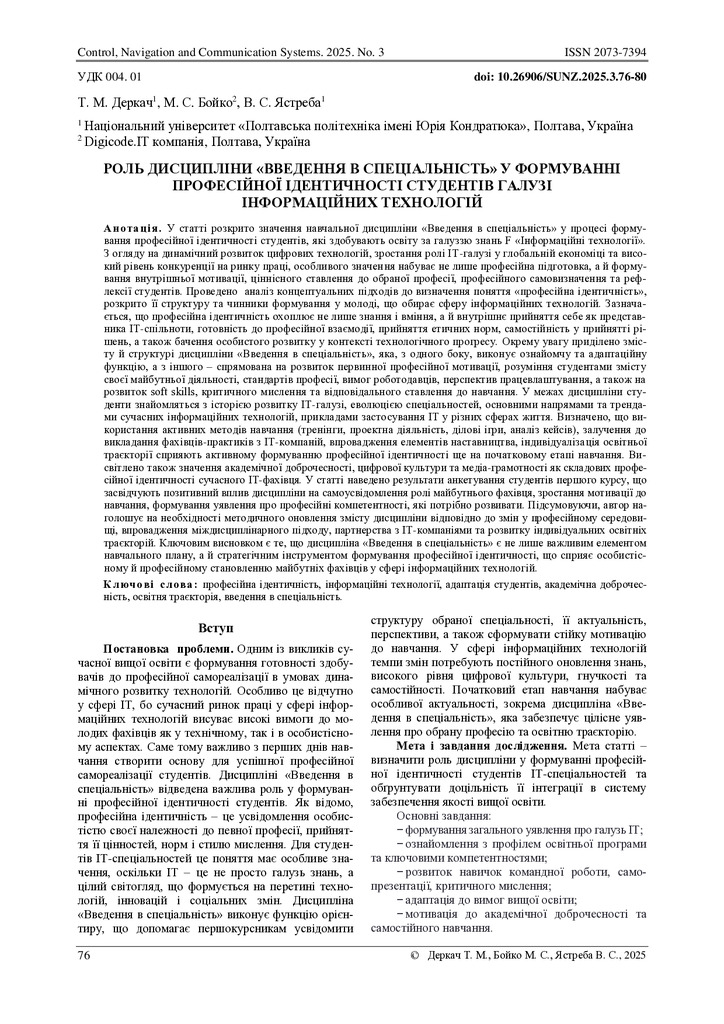 2025/11/20Роль дисципліни «введення в спеціальність» у формуванні професійної ідентичності студентів галузі інформаційних технологій