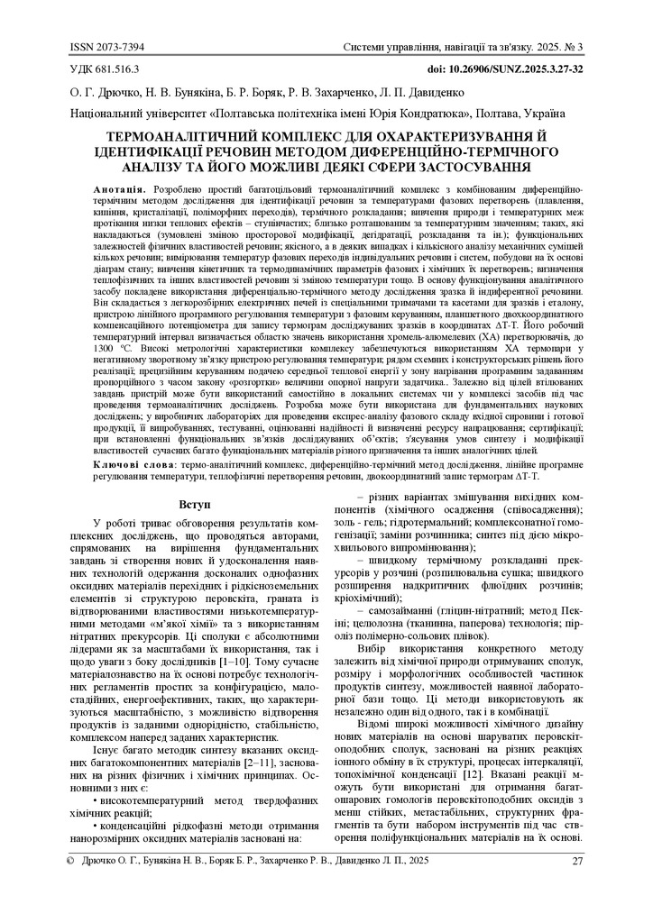2025/12/05Термоаналітичний комплекс для охарактеризування й ідентифікації речовин методом диференційно-термічного аналізу та його можливі деякі сфери застосування