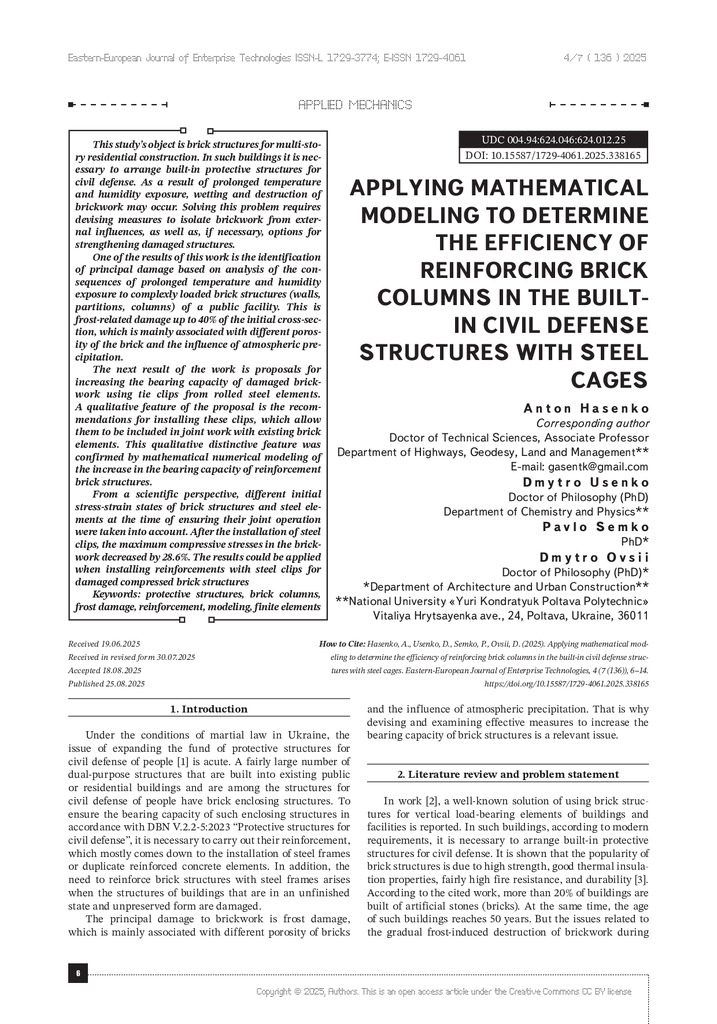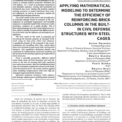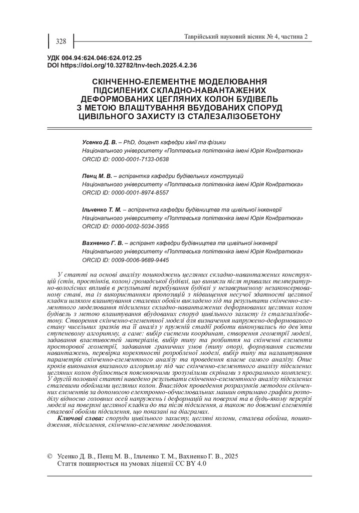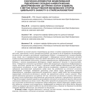 2025/12/15Скінченно-елементне моделювання підсилених складно-навантажених деформованих цегляних колон будівель з метою влаштування вбудованих споруд цивільного захисту із сталезалізобетону