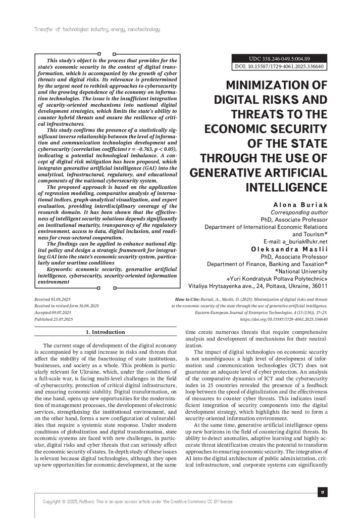 The object of this study is the process of ensuring the economic security of the state in the context of digital transformation, which is accompanied by the growth of cyber threats and digital risk...
