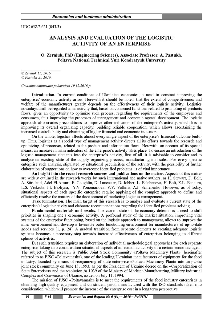 In article the authors define the role of logistics in the modern industrial enterprise in a highly competitive environment. The analysis of the current state of logistics conducted at PJSC «Polta...