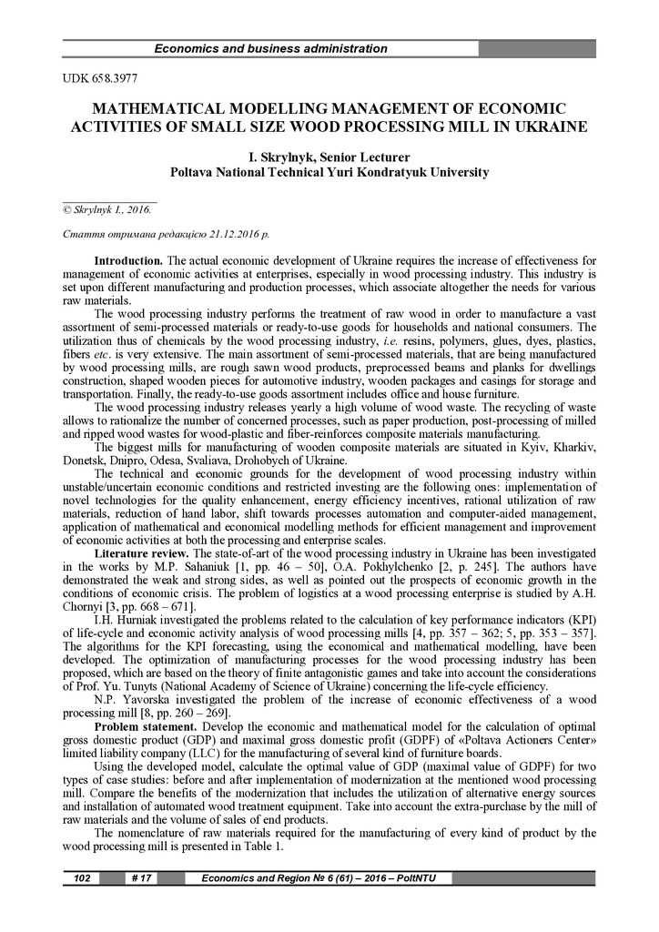 2018/12/14Mathematical Modelling Management of Economic Activities of Small Size Wood Processing Mill in Ukraine