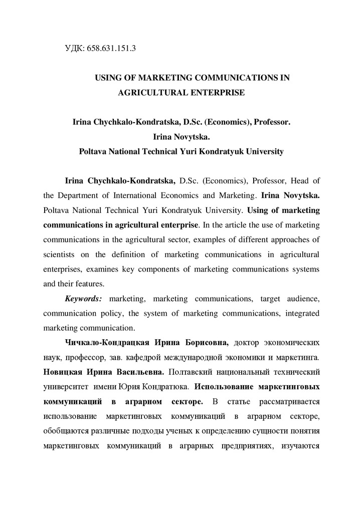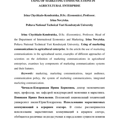 In the article the use of marketing communications in the agricultural sector, examples of different approaches of scientists on the definition of marketing communications in agricultural enterpris...