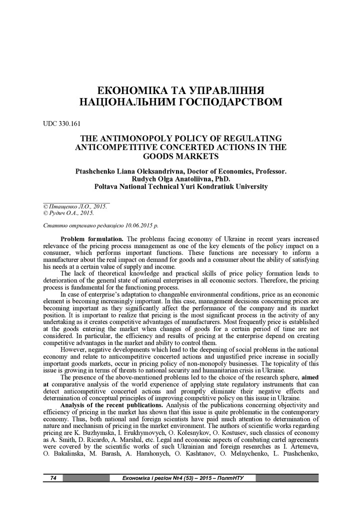 The issue of anticompetitive concerted actions and unjustified price increase in the goods markets was considered, the world experience of applying state regulatory instruments that can detect the...