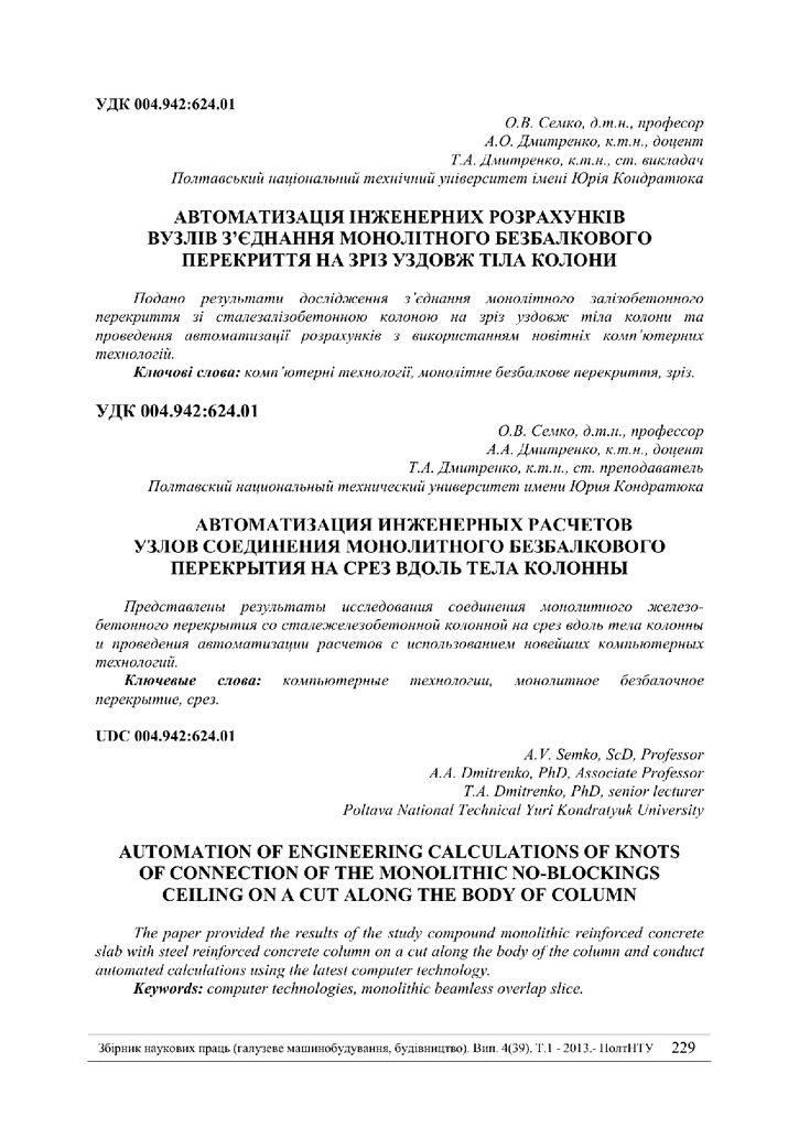 2018/05/30Автоматизація інженерних розрахунків вузлів з'єднання монолітного безбалкового перекриття на зріз уздовж тіла колони