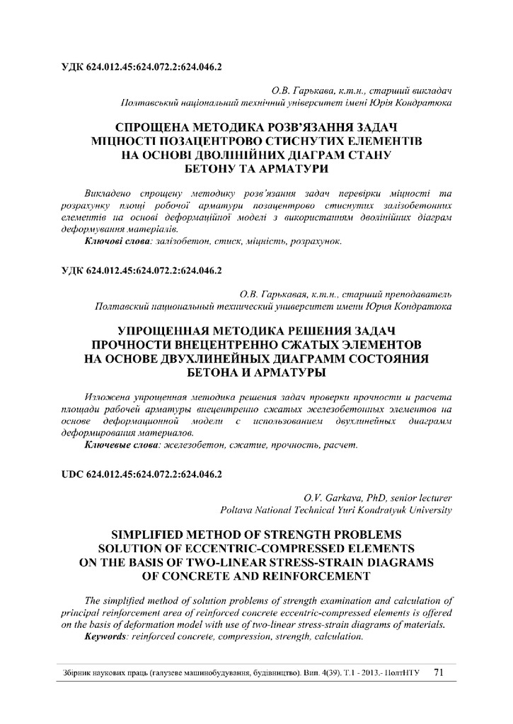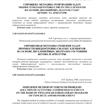 2018/05/30Спрощена методика розв'язання задач міцності позацентрово стиснутих елементів на основі дволінійних діаграм стану бетону та арматури