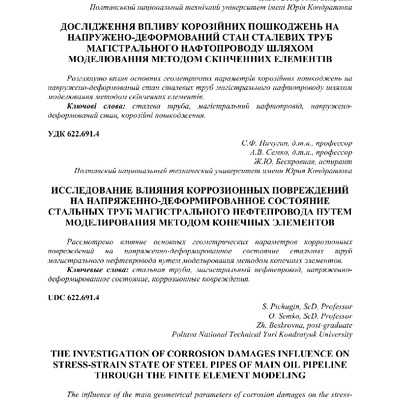 2019/02/19Дослідження впливу корозійних пошкоджень на напружено-деформований стан сталевих труб магістрального нафтопроводу шляхом моделювання методом скінченних елементів