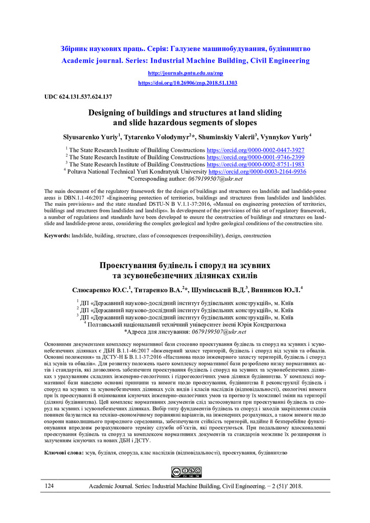 The main document of the regulatory framework for the design of buildings and structures on landslide and landslide-prone areas is DBN.1.1-46:2017 «Engineering protection of territories, buildings ...