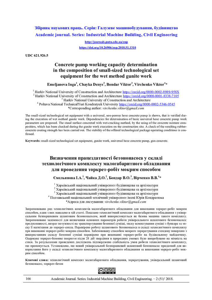 The small-sized technological set equipment with a universal, non-porous hose concrete pump is shown, that is verified during the execution of wet method gunite work. Dependencies for determination...