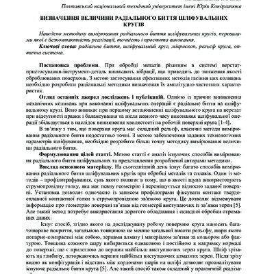 Наведено методику вимірювання радіального биття шліфувальних кругів, перевагами якої є безконтакт...