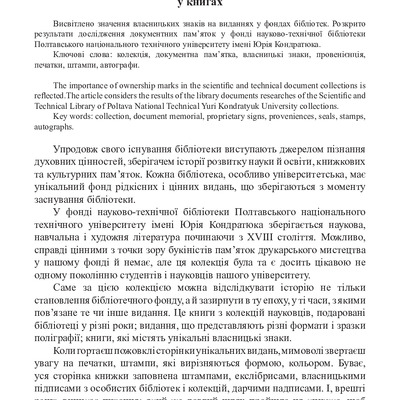 Висвітлено значення власницьких знаків на виданнях у фондах бібліотек. Розкрито результати дослід...