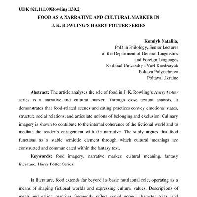 The article analyses the role of food in J. K. Rowling’s Harry Potter series as a narrative and cultural marker. Through close textual analysis, it demonstrates that food-related scenes and eating ...
