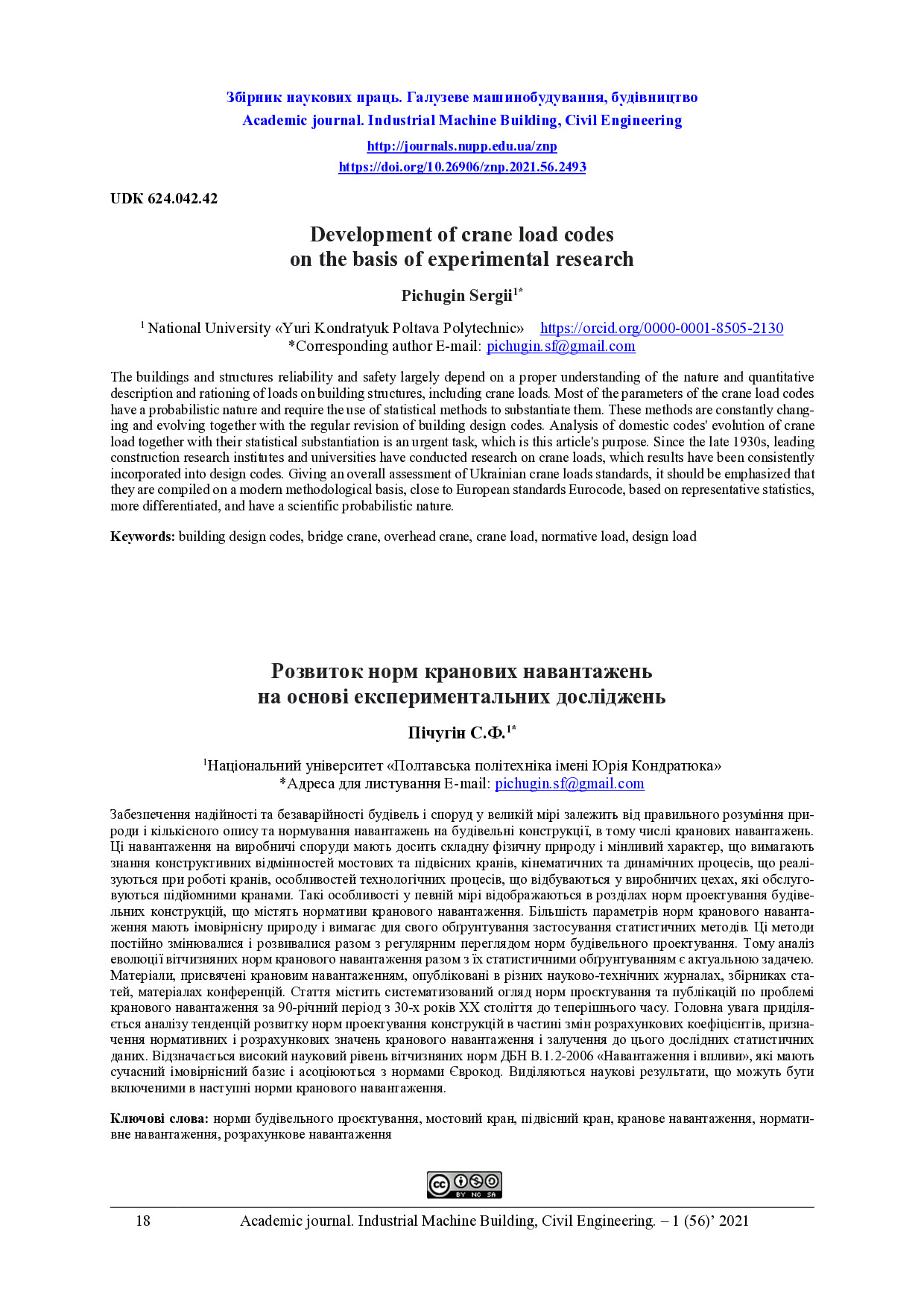 Pichugin S. Development of crane load codes on the basis of experimental research / S. Pichugin // Збірник наукових праць. Галузеве машинобудування, будівництво. – Полтава : Нац. ун-т імені Юрія Кондратюка, 2021. – Вип. 1 (56). – С. 18–29. – DOI:https://doi.org/10.26906/znp.2021.56.2493.
