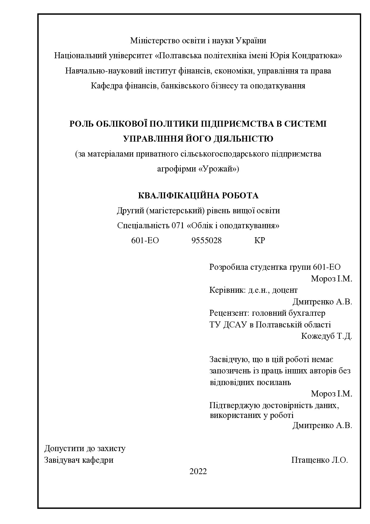 Роль облікової політики підприємства в системі управління його діяльністю (за матеріалами приватного сільськогосподарського підприємства агрофірми «Урожай»)
