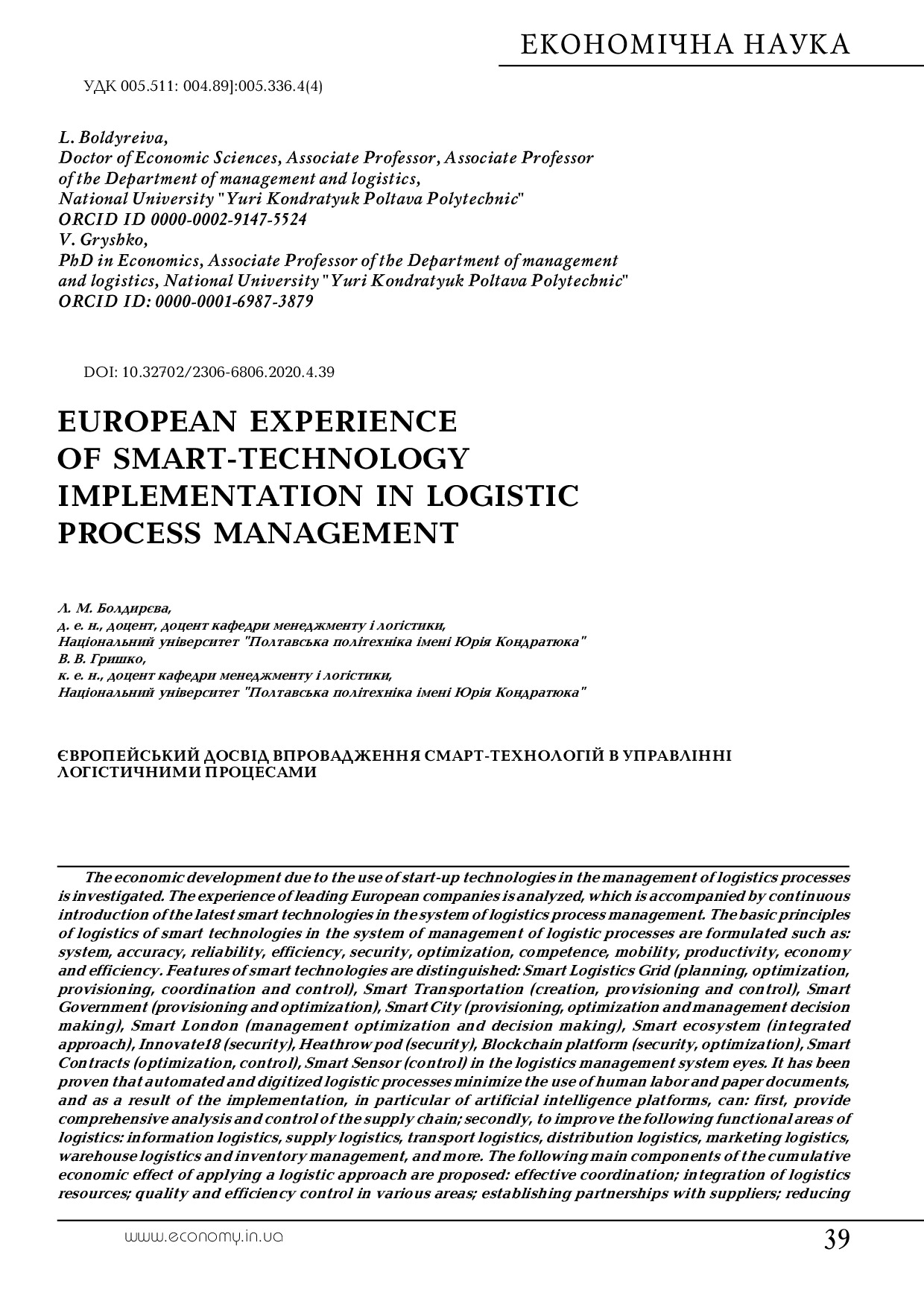 Boldyreiva L.M. European experience of smart-technology implementation in logistic process management / L.M. Boldyreiva, Viktor V. Gryshko // Економіка та держава. – 2020. – №4. – С. 39-43. – URL : http://www.economy.in.ua/pdf/4\_2020.pdf