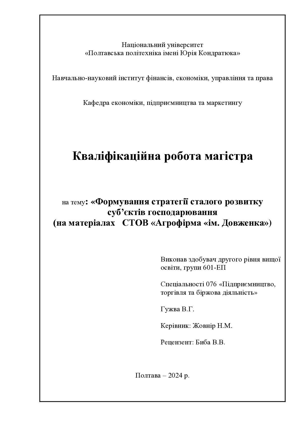 Формування стратегії сталого розвитку суб’єктів господарювання (на матеріалах СТОВ «Агрофірма «ім. Довженка»»)