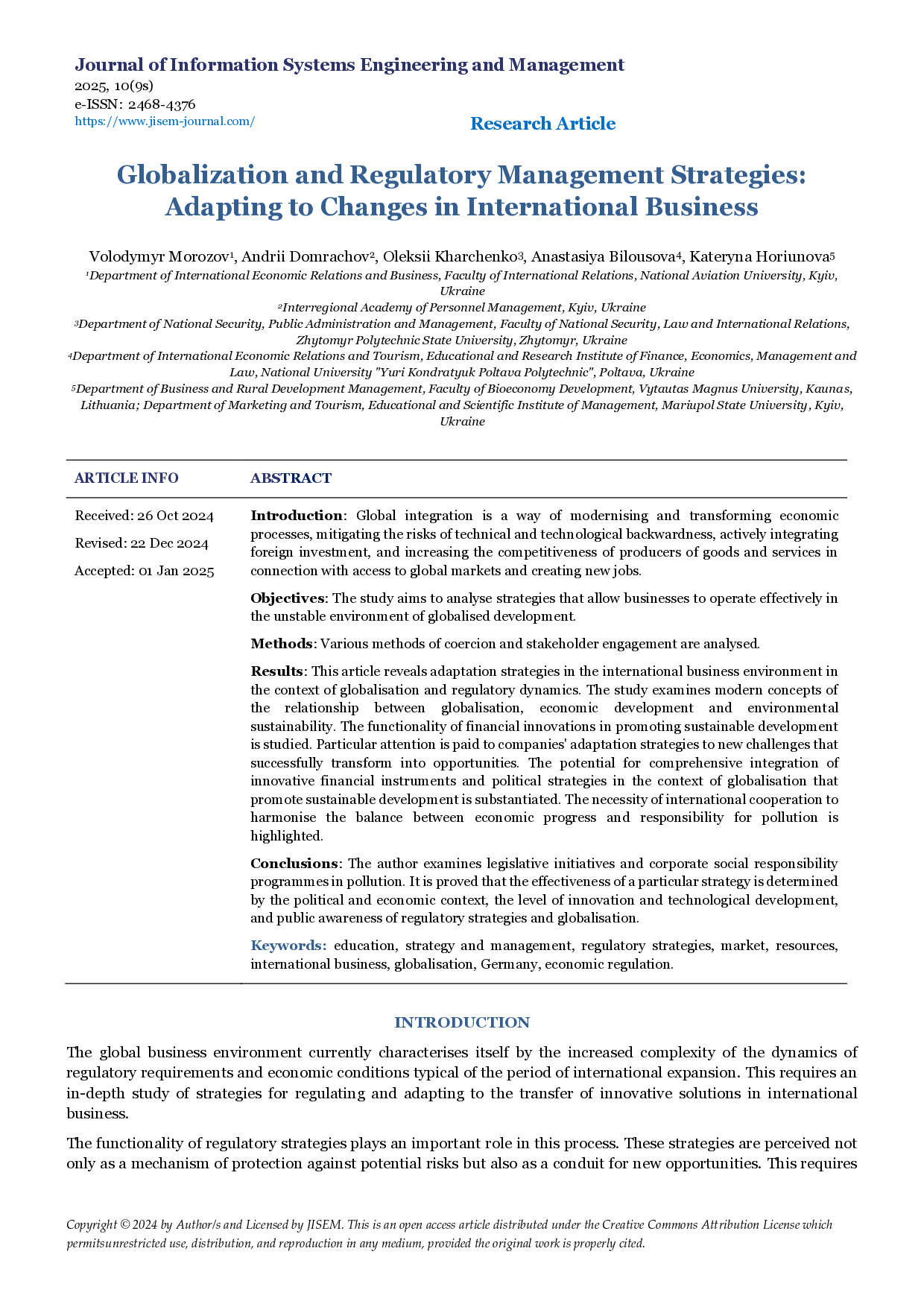 Globalisation and Regulatory Management Strategies: Adapting to Changes in International Business / V. Morozov, A. Domrachov, O. Kharchenko, A. Bilousova, K. Horiunova // Journal of Information Systems Engineering and Management. – 2025. – Vol. 10, № 9s. – P. 35-42. – https://doi.org/10.52783/jisem.v10i9s.1134