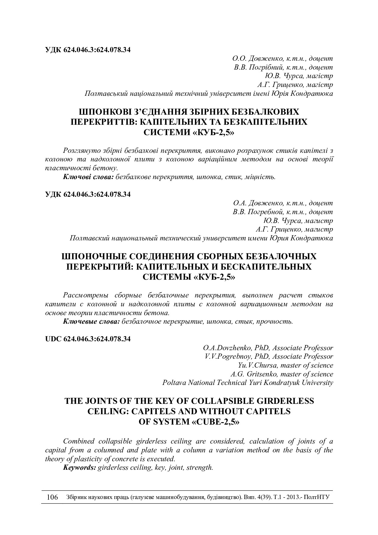 Шпонкові з’єднання збірних безбалкових перекриттів: капітельніх та безкапітельних системи "КУБ-2,5"