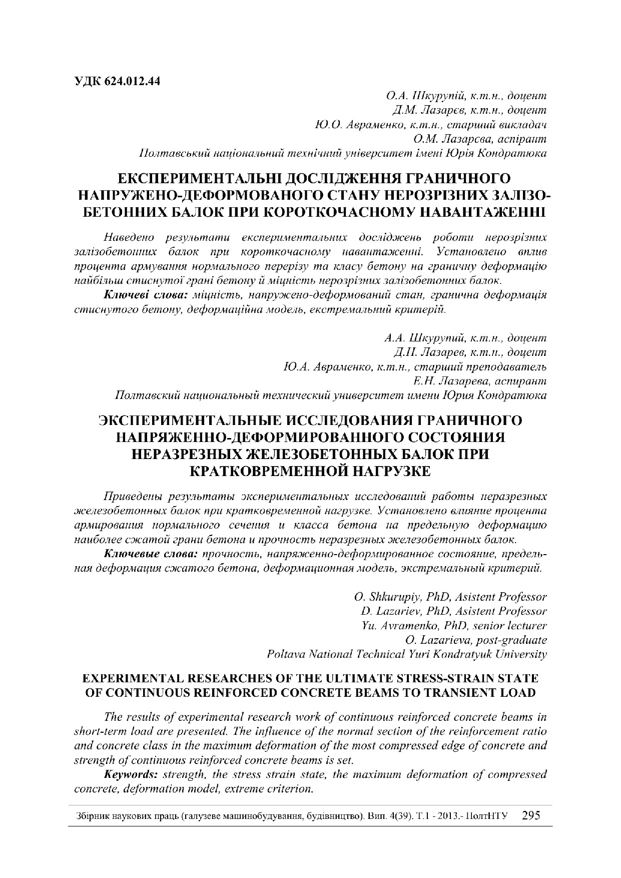 Експериментальні дослідження граничного напружено-деформованого стану нерозрізних залізобетонних балок при короткочасному навантаженні