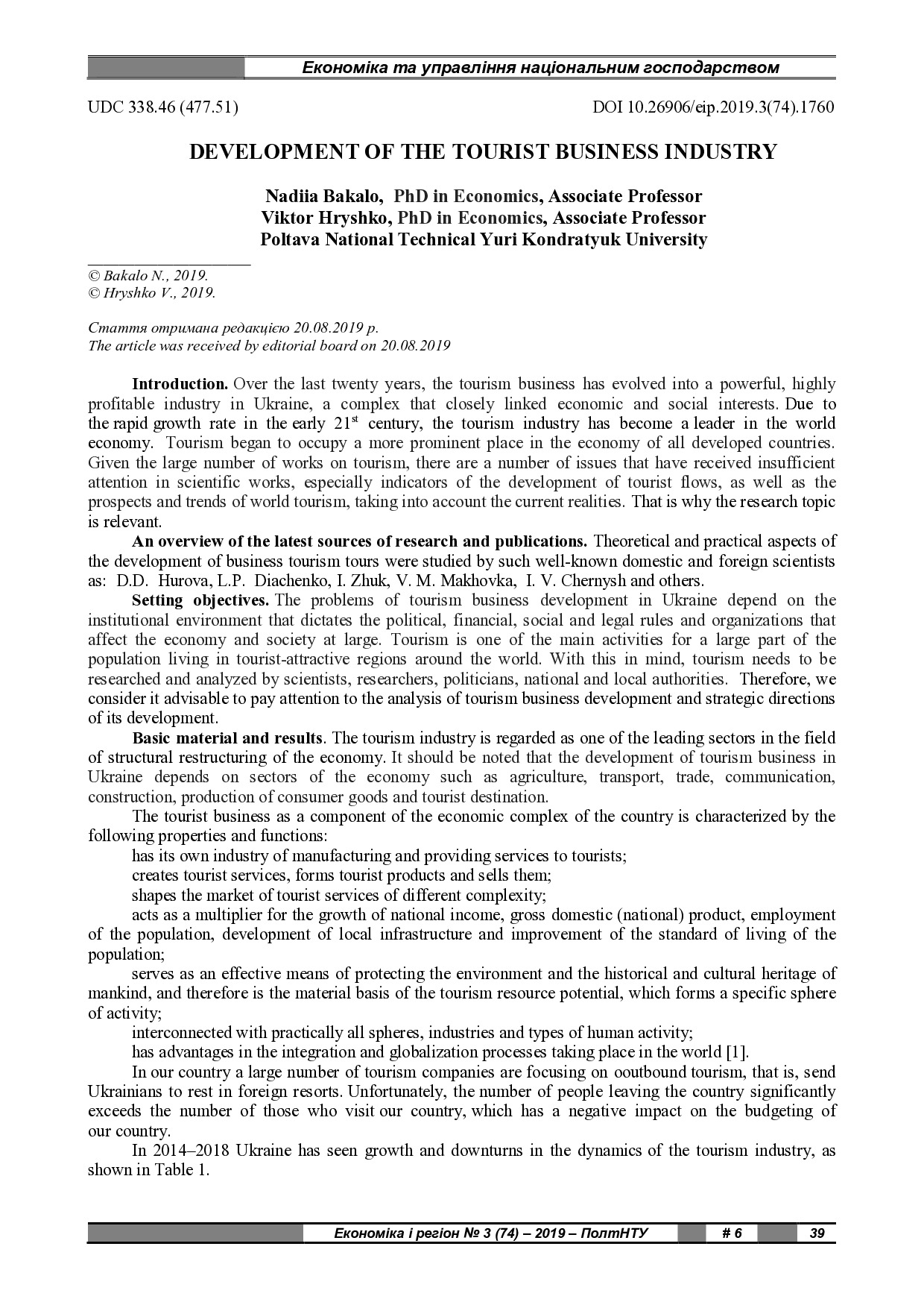 Development of the Tourist Business Industry
