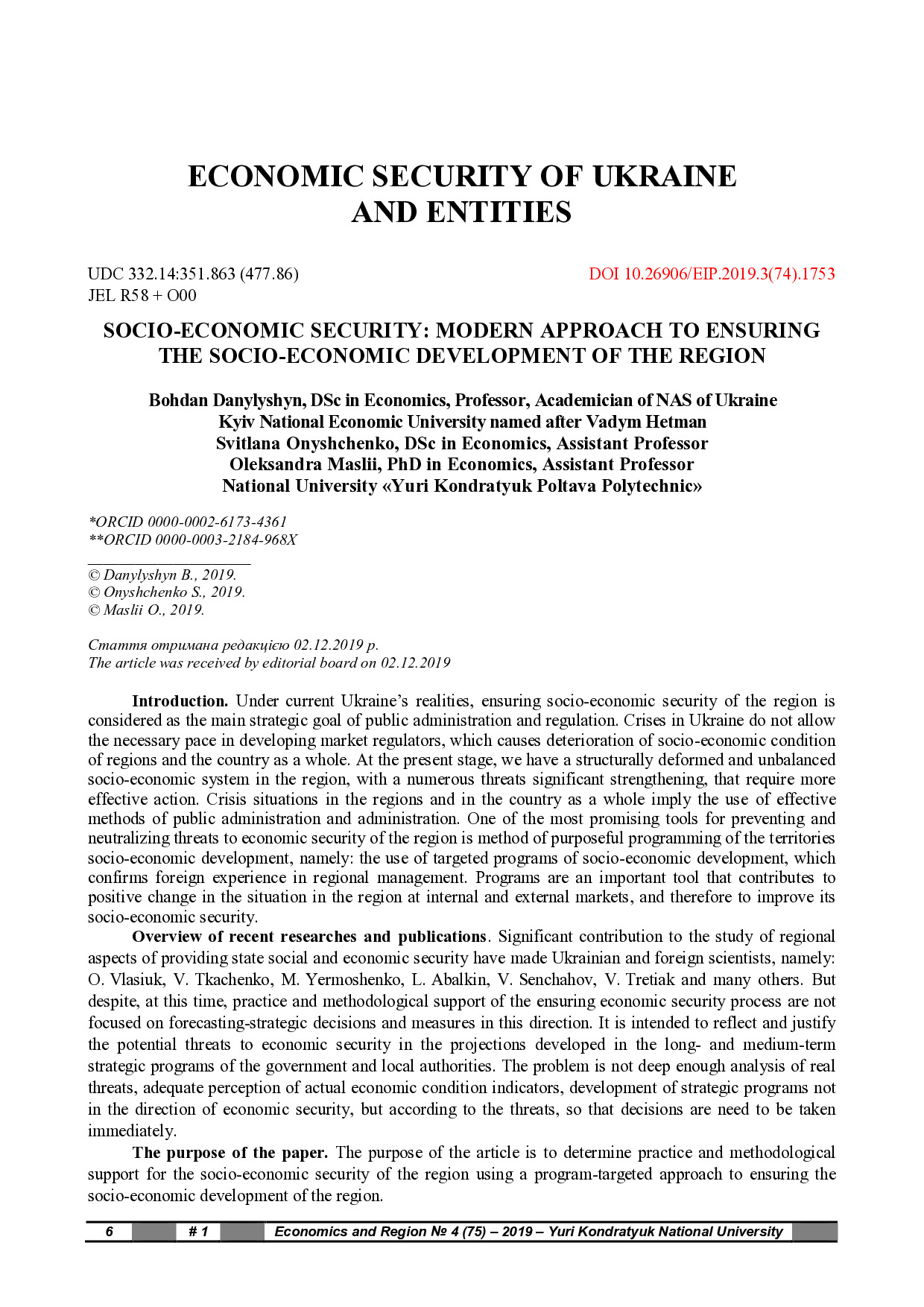 Socio-economic security: modern approach to ensuring the socio-economic development of the region