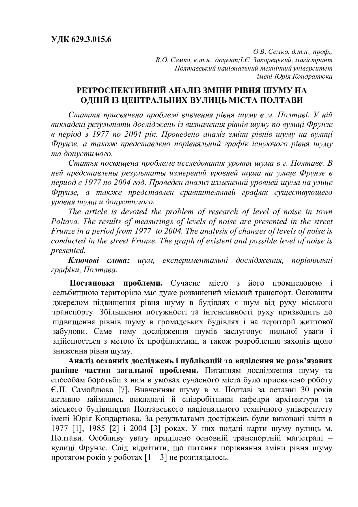 Ретроспективний аналіз зміни рівня шуму на одній із центральних вулиць міста Полтави