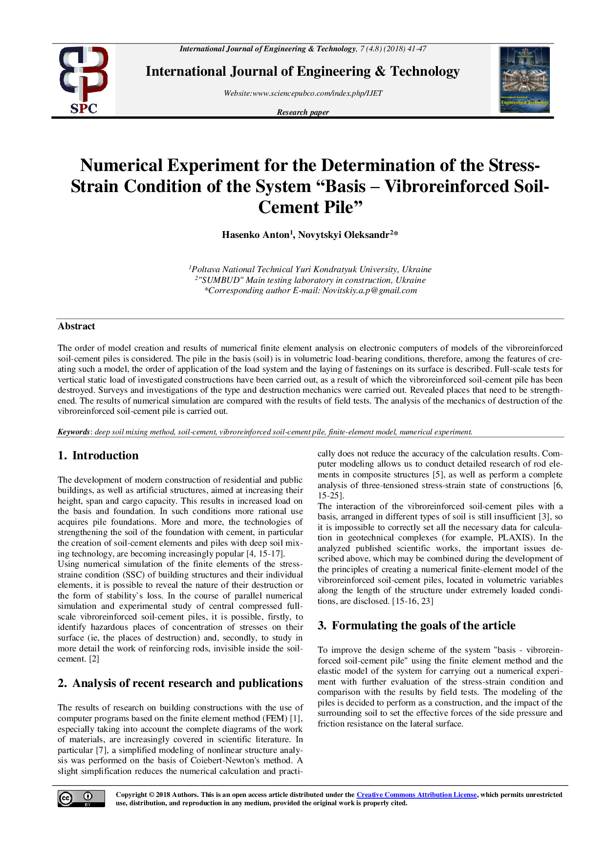 Numerical experiment for the determination of the stressstrain condition of the system “basis – vibroreinforced soilcement pile”