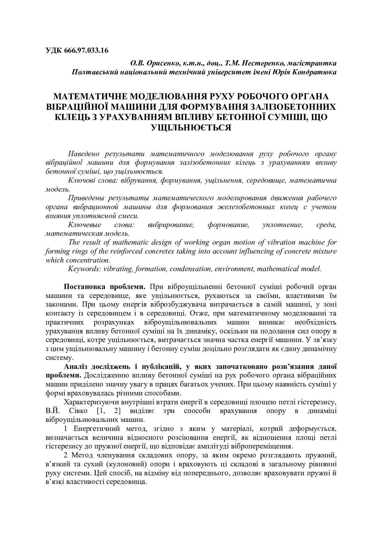 Математичне моделювання руху робочого органа вібраційної машини для формування залізобетонних кілець з урахуванням впливу бетонної суміші, що ущільнюється