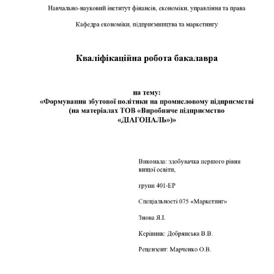 Формування збутової політики на промисловому підприємстві (на матеріалах ТОВ „Виробниче підприємство „ДІАГОНАЛЬ”)