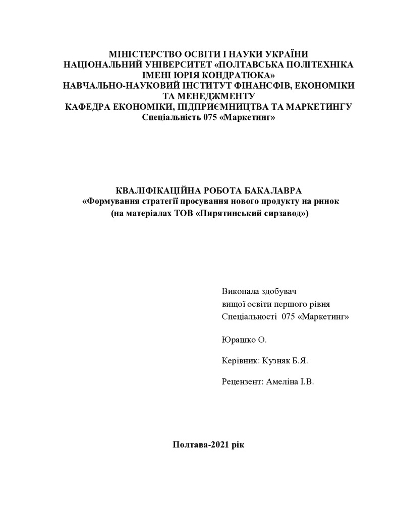 Формування стратегії просування нового продукту на ринок (на матеріалах ТОВ «Пирятинський сирзавод»)