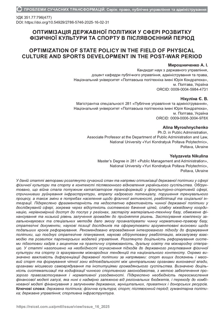 Стаття 2025/07/23Оптимізація державної політики у сфері розвитку фізичної культури та спорту в післявоєнний період