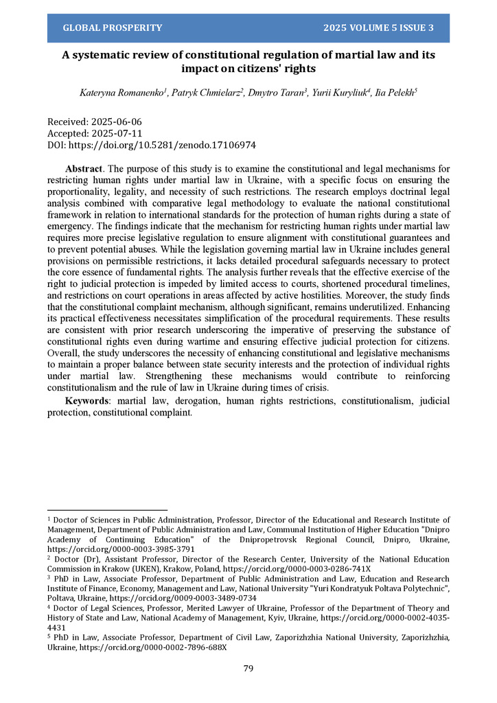 The purpose of this study is to examine the constitutional and legal mechanisms for restricting human rights under martial law in Ukraine, with a specific focus on ensuring the proportionality, leg...