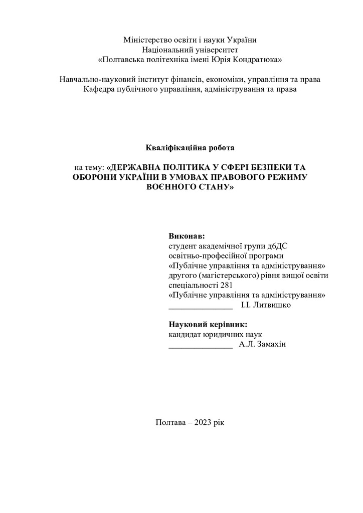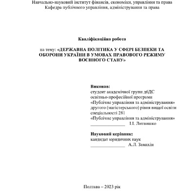 У роботі розглянуто теоретичні засади реалізації державної політики в сфері безпеки та оборони в ...