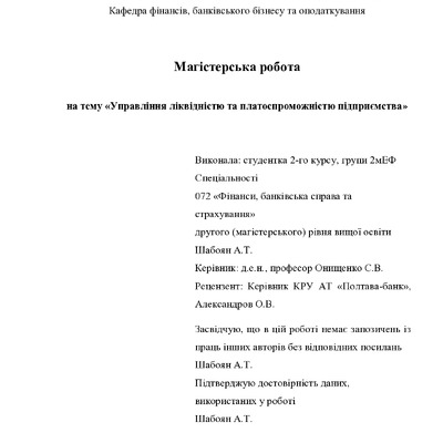 Управління ліквідністю та платоспроможністю підприємства