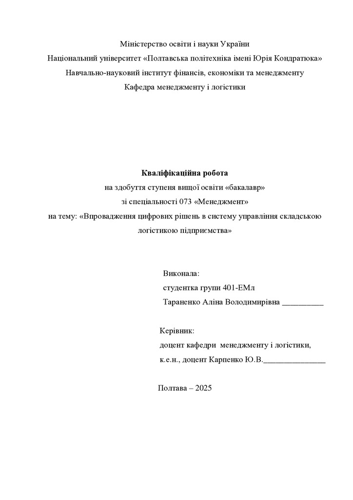 Впровадження цифрових рішень в систему управління складською логістикою підприємства