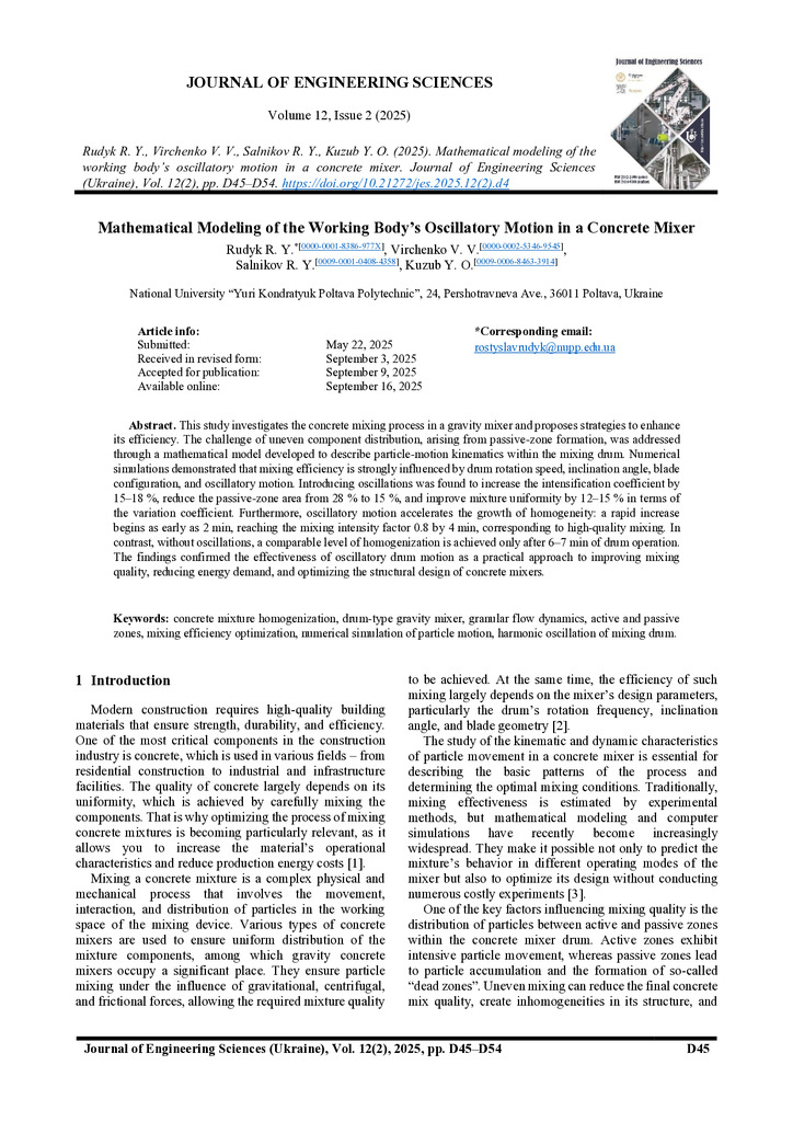 Стаття 2025/12/02Mathematical Modeling of the Working Body’s Oscillatory Motion in a Concrete Mixer