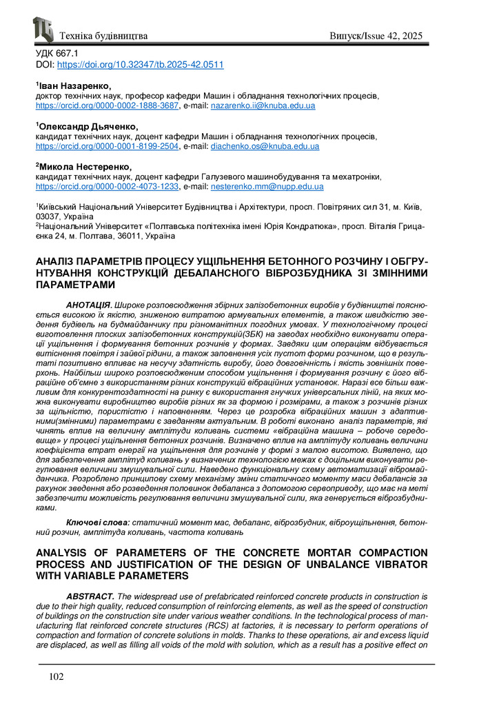 Стаття 2025/12/02Аналіз параметрів процесу ущільнення бетонного розчину і обгрунтування конструкцій дебалансного віброзбудника зі змінними параметрами