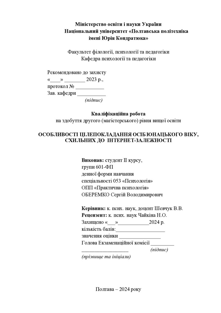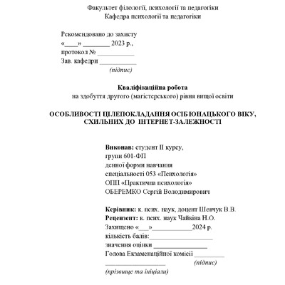 Особливості цілепокладання осіб юнацького віку, схильних до Інтернет-залежності