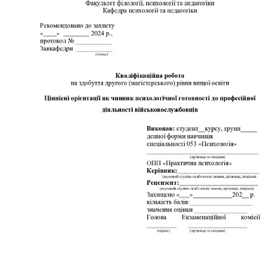 Мета кваліфікаційної роботи полягає у вивченні та аналізі впливу ціннісних орієнтацій на психологічну готовність військовослужбовців до їх професійної діяльності, а також на визначення зв’язку між ...